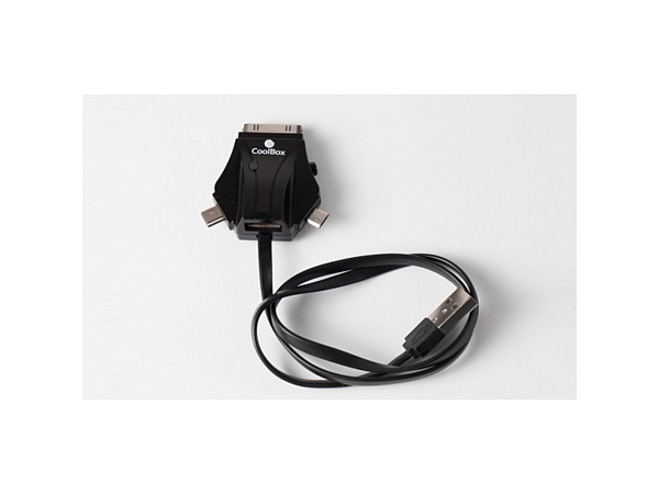 Cable de datos y carga para móviles, cámaras, reproductores MP3 y GPS a través de un puerto USB libre. Conectores USB, microUSB y miniUSB , IPhone e IPod.