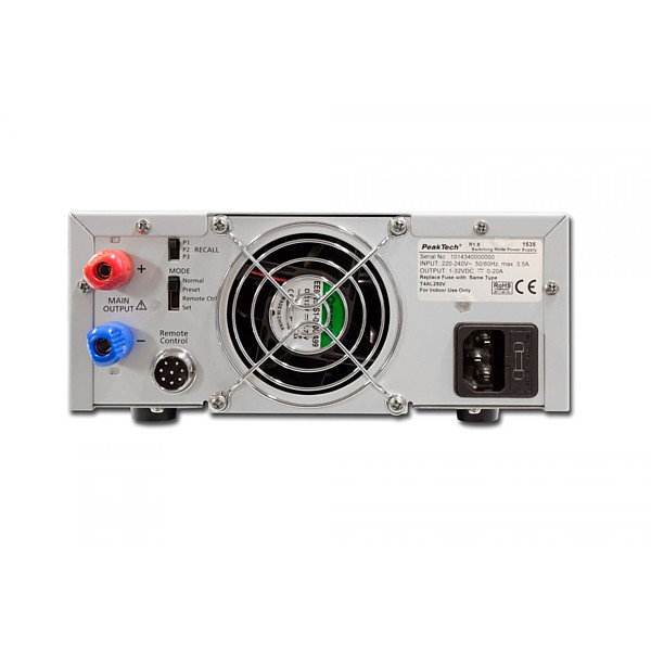 El PeakTech 1535 es una fuente de alimentación de alto rendimiento para un máximo de 32V/20A DC, equivalente a 640W de potencia continua. Los botones de doble función (ajuste aproximativo y preciso) permiten un ajuste preciso, rápido y sencillo de los valores de voltaje y corriente gracias al codificador rotativo y el microprocesador de control. Alternativamente, existe una conexión en la parte trasera para control analógico y un interruptor para variar entre valores preestablecidos. El control de ventilación inteligente ajusta la velocidad de la ventilación a la temperatura. El voltaje de salida y el límite de corriente pueden establecerse sin una carga conectada. Todas estas características junto con su alto rendimiento y su diseño compacto hacen de esta fuente de alimentación un aparato ideal para la industria y la ingeniería mecánica.