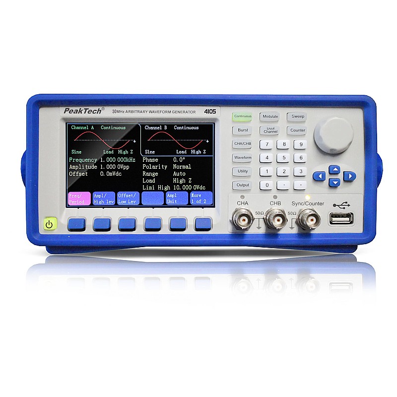 Este generador de formas de onda de gran calidad tiene excelentes propiedades técnicas y gran variedad de funciones. Los dos canales equivalentes de salida, el amplio número de formas de onda arbitrarias en su memoria y los diferentes tipos de modulación son especialmente destacables. También es posible acoplar el generador a un ordenador, lo que permite modificar las formas de onda y los tipos de modulación con facilidad mediante el software incluido. Dadas las muchas opciones que el PeakTech 4105 ofrece, es perfecto para casi todas las tareas en investigación, desarrollo y entrenamiento.